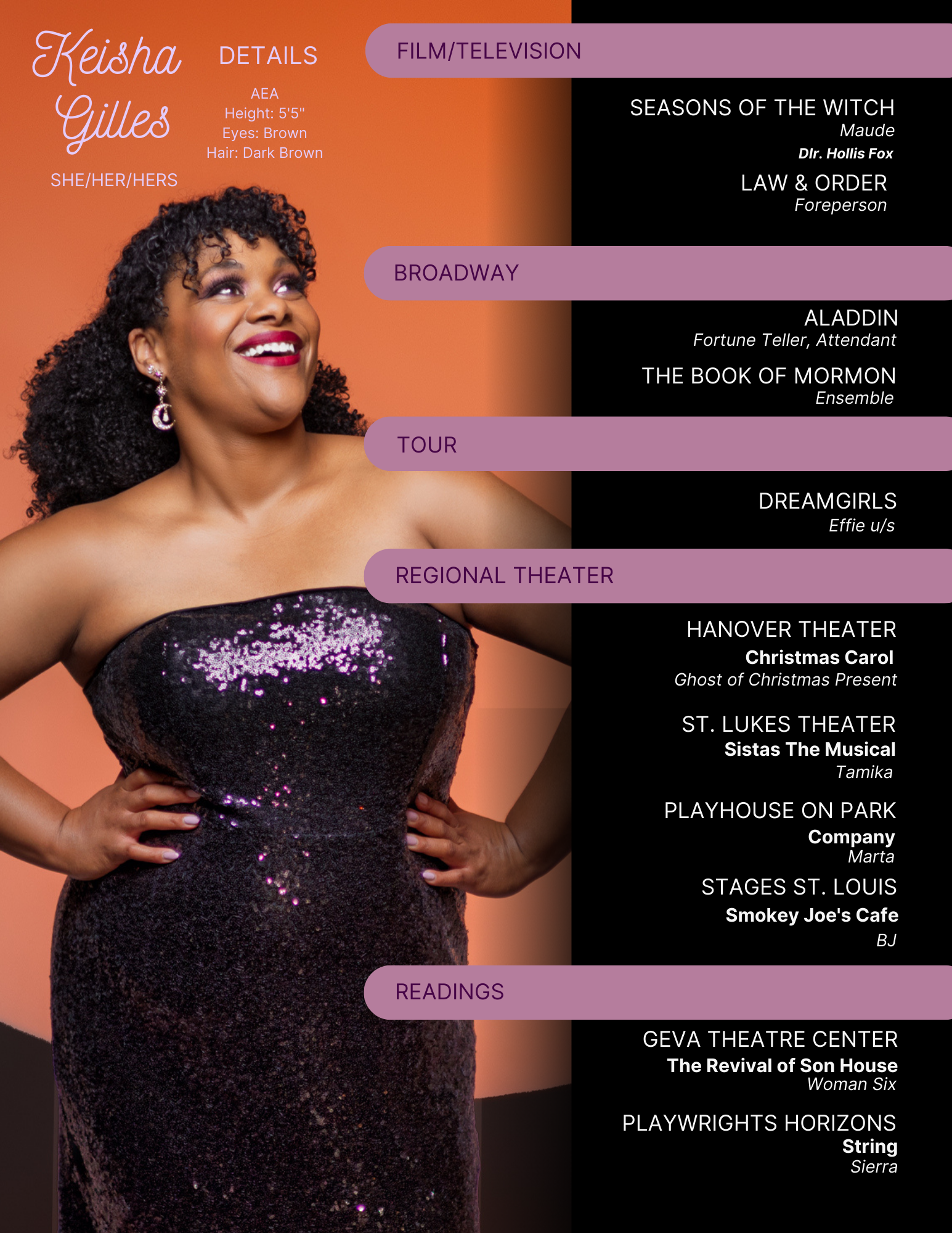 Keisha Gilles is a seasoned theater, and television actress. Her passion lies in musical theater. She is currently looking for opportunities in film, television and straight theater. Click here for reel, resume, and headshots.